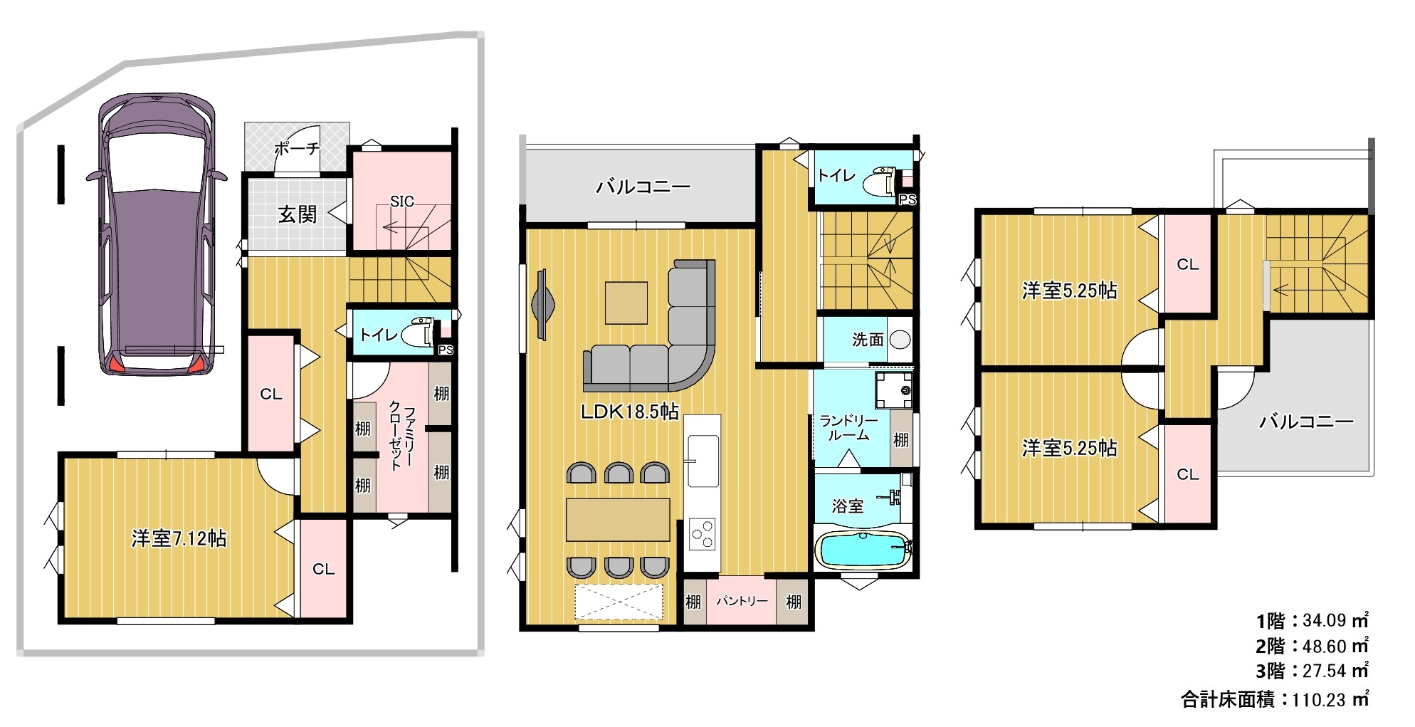 A号地 間取図 1階:34.09㎡ 2階:48.60㎡ 3階:27.54㎡ 床面積合計:110.24㎡ 土地・建物価格:4480万円(消費税込)